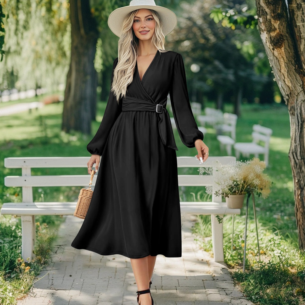 Robe midi élégante à col V avec ceinture nouée